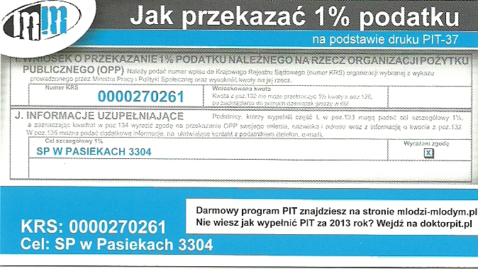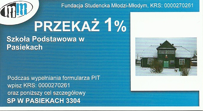 Prosimy również wszystkich sympatyków szkoły rozliczających się z Urzędem Skarbowym o dalsze przekazywanie 1% podatku na rzecz naszej placówki.Podczas wypełniania PIT wystarczy wpisać KRS : 0000270261 oraz cel szczegółowy SP w Pasiekach 3304