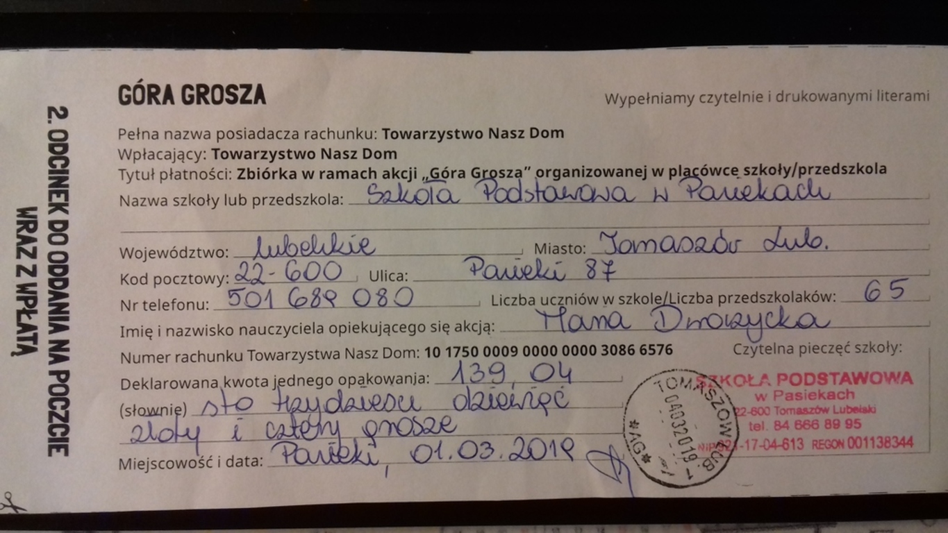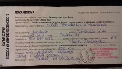 Samorząd Uczniowski zakończył i podsumował ogólnopolską akcję "Góra grosza", której celem jest pomoc dzieciom przebywającym w rodzinach zastępczych. Członkowie SU podliczyli i zapakowali pieniądze, a opiekun SU nadał przesyłkę na poczcie.