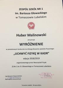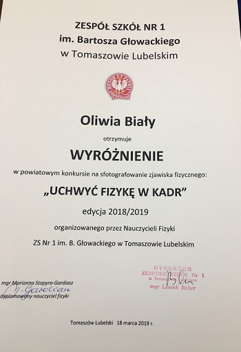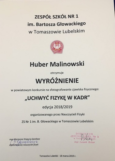 Dwoje naszych uczniów otrzymało wyróżnienie na 67 nadesłanych prac, których tematem wiodącym było uchwycenie zjawiska fizycznego w obiektywie aparatu. Byli to: Oliwia Biały kl. VII i Hubert Malinowski kl. VIII.