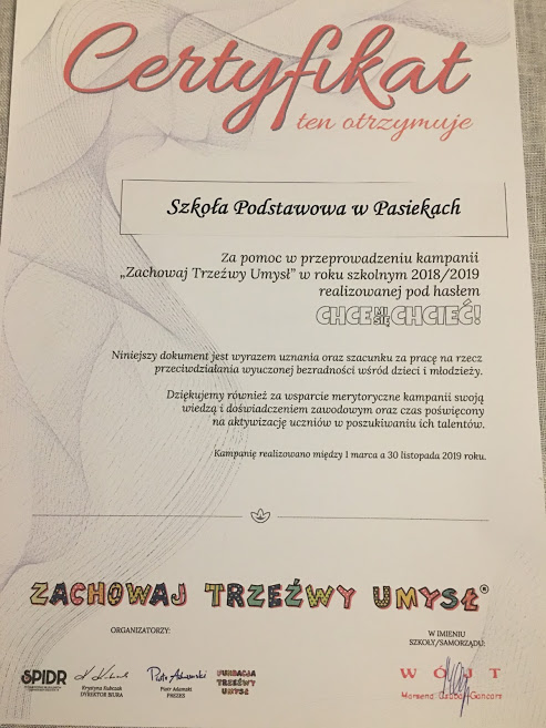 Dziś tj. 05.06.2019r. nasi uczniowie uczestniczyli w uroczystym podsumowaniu kampanii „Zachowaj Trzeźwy Umysł” prowadzonej w roku szkolnym 2018/2019 na terenie Gminy Tomaszów Lub. pod hasłem CHCE MI SIĘ CHCIEĆ!.