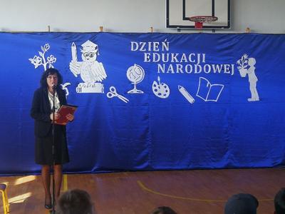 Z okazji zbliżającego się Dnia Edukacji Narodowej Pani Dyrektor Ewa Probola podczas uroczystej akademii złożyła najserdeczniejsze życzenia wszystkim nauczycielom, uczniom i pracownikom obsługi. Uczniowie pod kierunkiem Pani Aleksandry Pitury Dobek, Anny Gozdek oraz Jolanty Grzesik przygotowali zabawną część artystyczną, która ukazała blaski i cienie pracy nauczyciela.