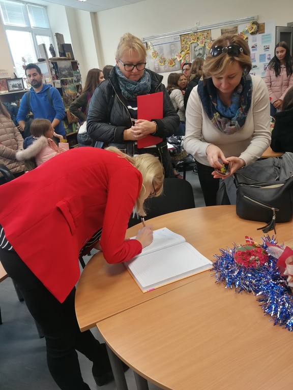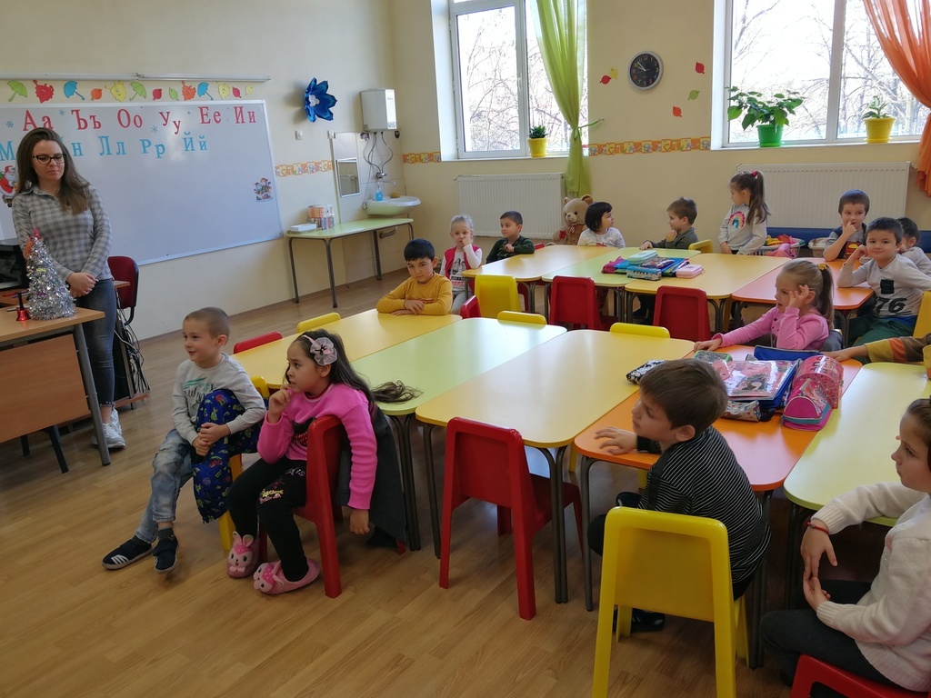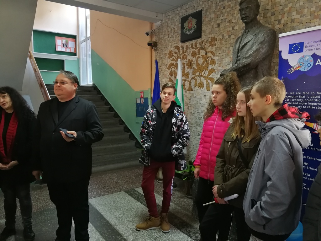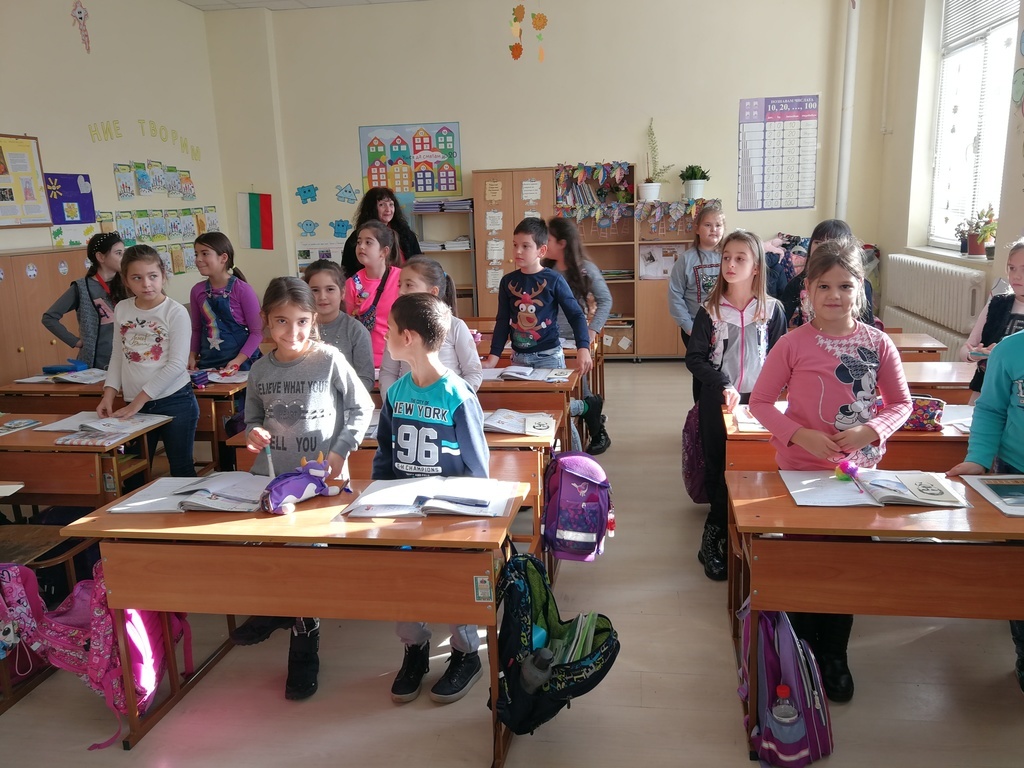 Po przybyciu na miejsce wszyscy przedstawiciele szkół partnerskich zostali ciepło przywitani przez Dyrektora szkoły pana Trifona Jordanova, który w kilku słowach przedstawił historię placówki i zaprosił do obejrzenia sal lekcyjnych. W każdej odwiedzanej klasie czekała na gości niespodzianka – zaśpiewana przez przedszkolaków w języku bułgarskim piosenka, narysowana bombka choinkowa czy własnoręcznie przepisany przez dzieci fragment prozy znanego w Bułgarii poety pochodzącego właśnie z Chirpanu.