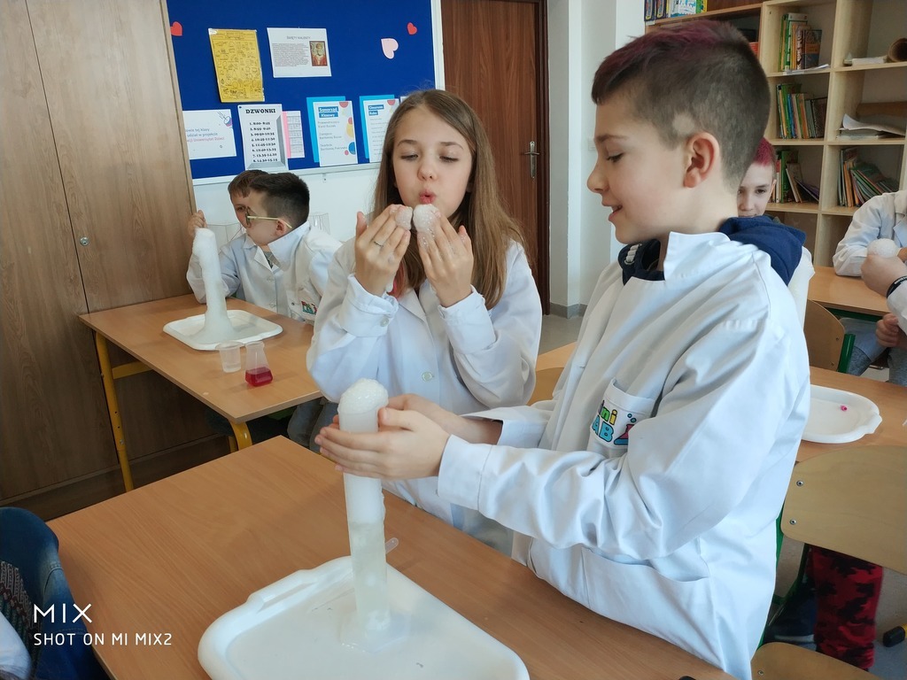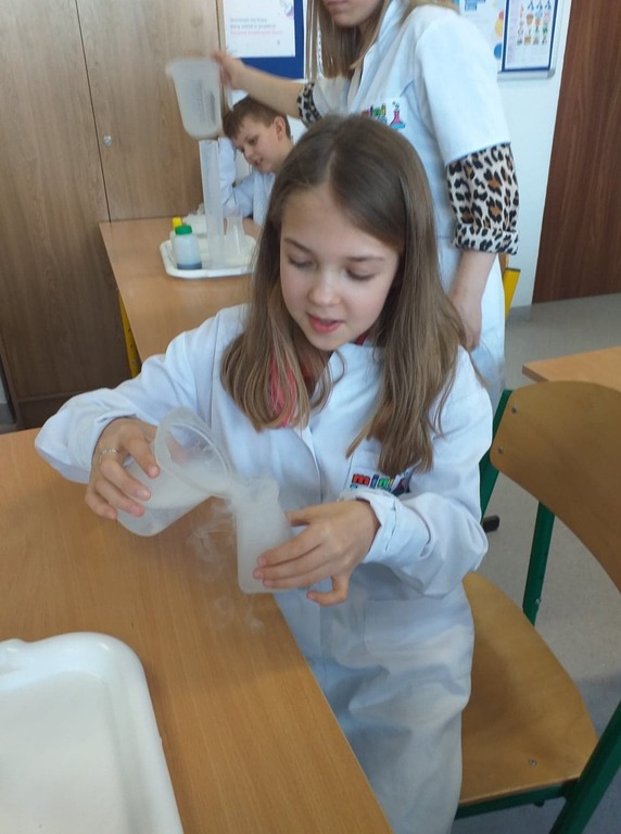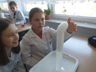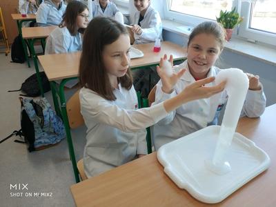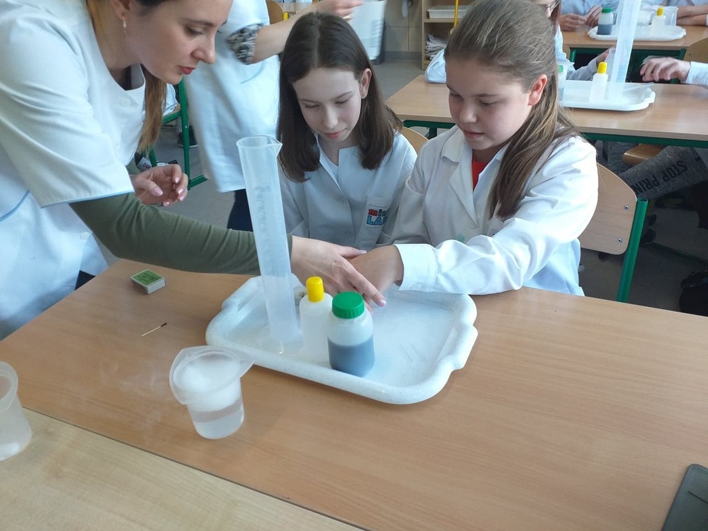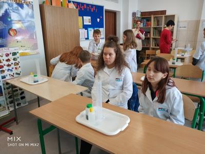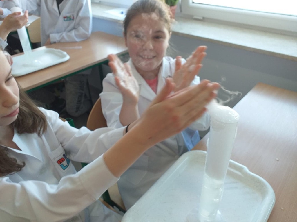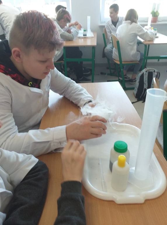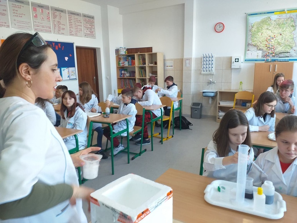 W ramach akcji w szkole odbyły się profesjonalnie przeprowadzone pokazy fizyczno-chemiczne, które wzbudziły w uczniach niemałe emocje. Były więc i kontrolowane wybuchy, i substancje zmieniające kolor wody. W części warsztatowej uczniowie m.in. badali właściwości suchego lodu.