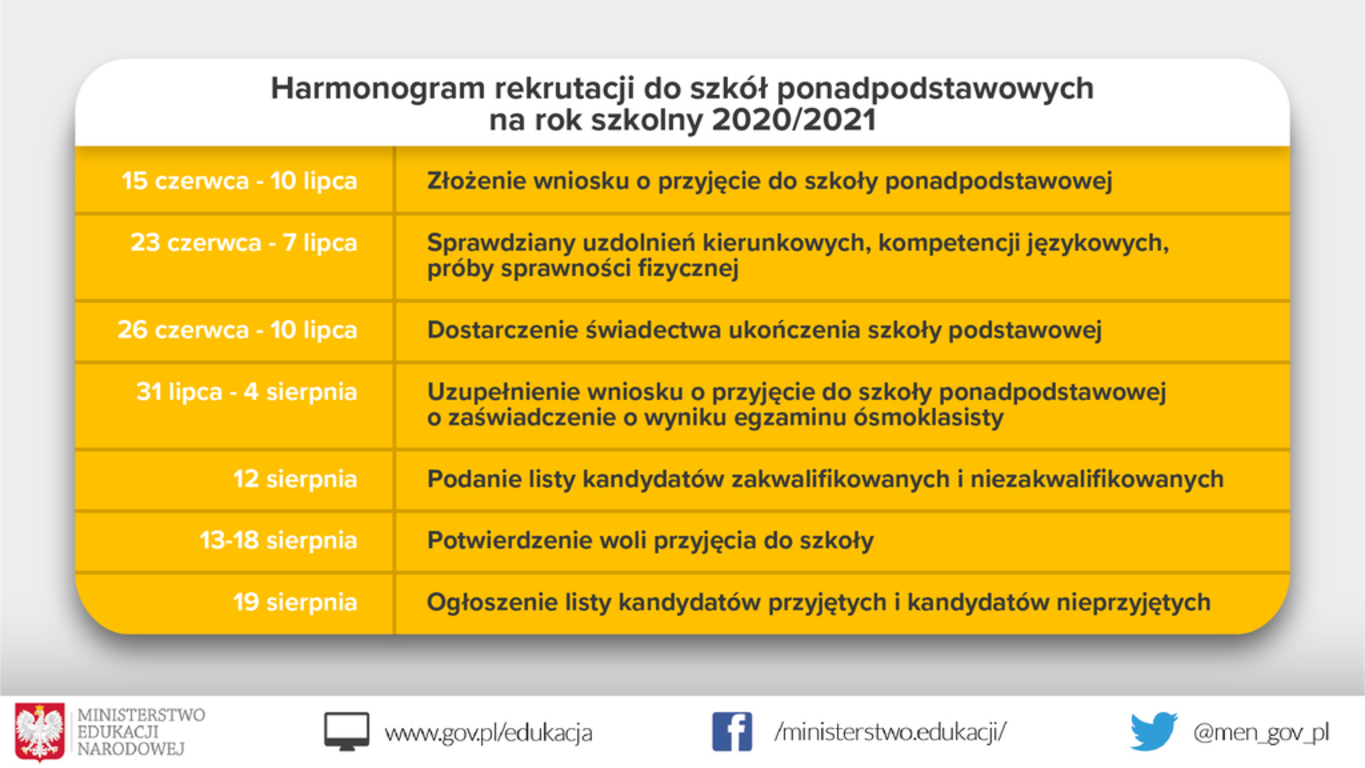 Ustalony przez Ministra Edukacji Narodowej harmonogram postępowania rekrutacyjnego do szkół dla młodzieży dostosowany został do zmienionego terminu przeprowadzanych egzaminów ósmoklasisty, w tym terminu wydania zaświadczenia o wyniku tego egzaminu przez okręgowe komisje egzaminacyjne.