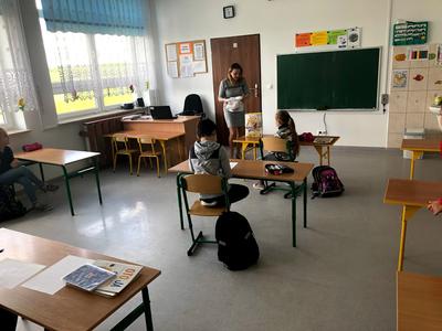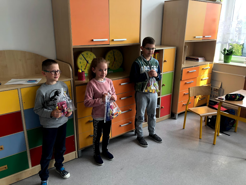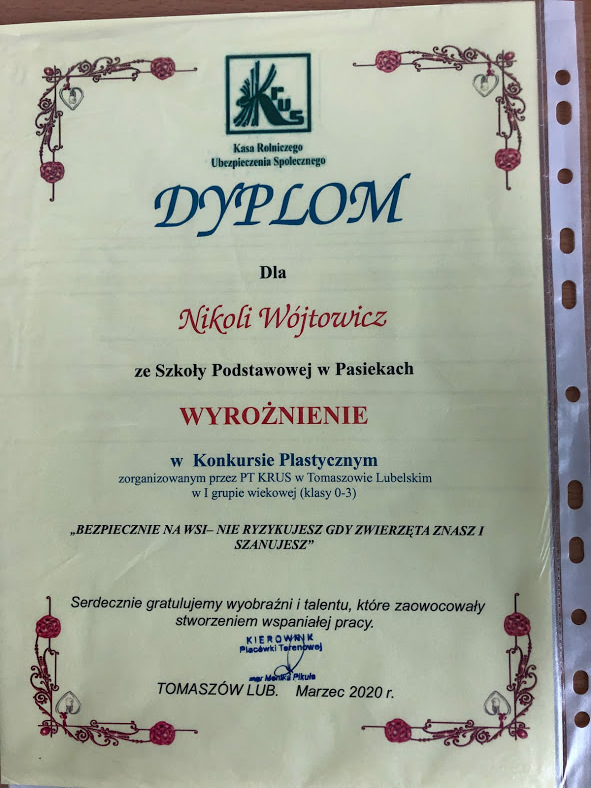 Dodatkową niespodzianką było dostarczenie przez pracownika KRUS-u dyplomów i nagrody wyróżnienia dla naszych uczniów , którzy brali udział w marcowym konkursie plastycznym „ Bezpiecznie na wsi- nie ryzykujesz gdy zwierzęta znasz i szanujesz”