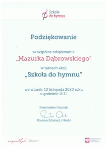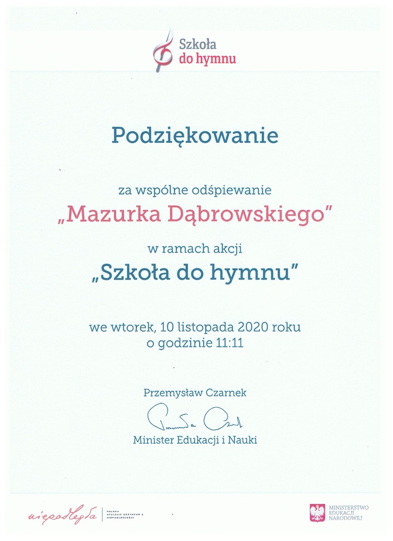 Podziękowanie Szkoła Podstawowa w Pasiekach otrzymała od Minista Edukacji Narodowej Pana Przemysława Czarnka podziękowanie za udział w akcji "Szkoła do Hymnu". Zdjęcia Zobacz również Konkurs na najpiękniejszy różaniec Moja ulubiona tajemnica różańca świętego- konkurs... Akcja Chryzantemy Podziękowanie Bezpieczeństwo podczas zdalnych lekcji Biblioteka Szkolna 16 listopada 2020 Aktualności Wydrukuj Udostępnij Wyświetlono: 171