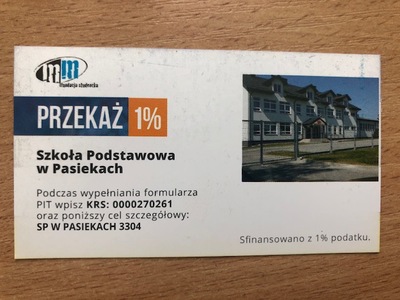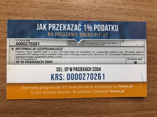 Uprzejmie prosimy o przekazanie 1% podatku dochodowego za rok 2020 na rzecz pomocy naszej szkole. W mijającym roku z odpisów od podatku przekazanych na naszą rzecz uzyskaliśmy sumę 720 zł za co serdecznie dziękujemy. Środki te są przeznaczone na stypendia motywacyjne dla naszych ambitnych uczniów. Od tego roku szkolnego dodatkowo zamierzamy inwestować w rozwój infrastruktury technicznej umożliwiającej korzystanie z nowoczesnych technologii. Środki pozyskane z odpisu oraz darowizn będą gromadzone na zakup tablicy multimedialnej do jednej z klas.