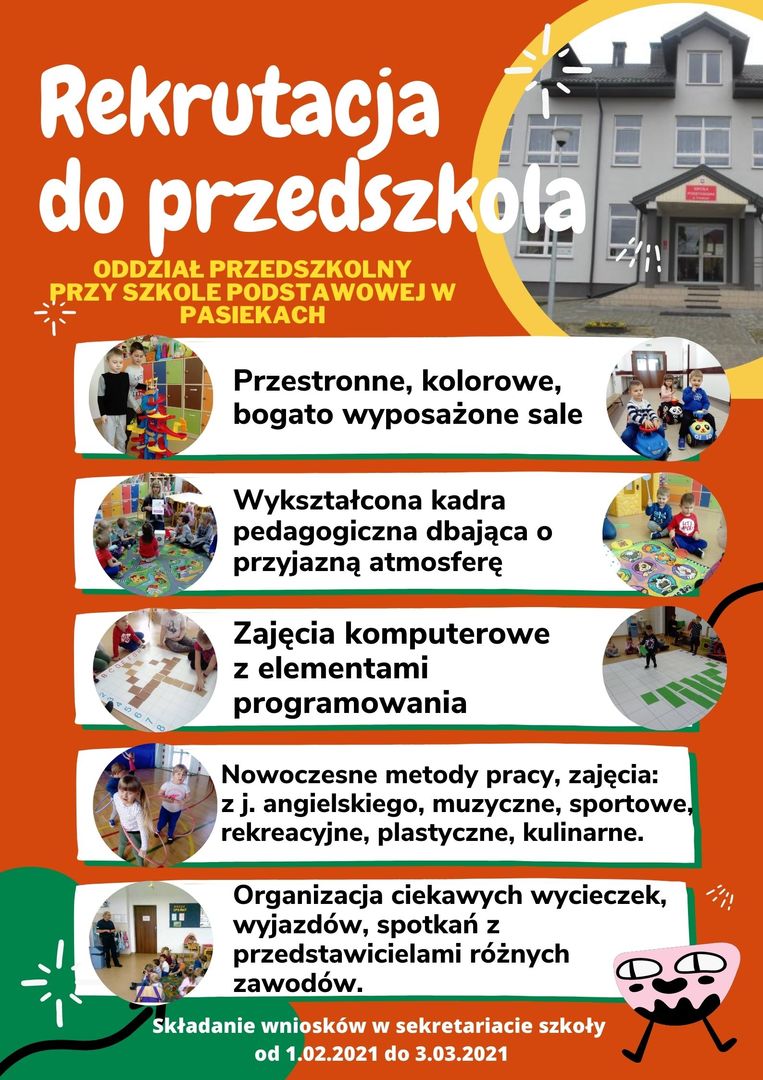 Rekrutacja do przedszkola 2021 Zachęcamy do zapoznania się z ofertą naszego przedszkola. Dokumenty do pobrania w sekretariacie szkoły i na stronie www. W razie pytań prosimy o kontakt pod numerem telefonu Sekretariatu Szkoły: 846668995. Zdjęcia Zobacz również Bal karnawałowy 2021 Zawody Narciarskie o Puchar Wójta Gminy Tomaszów... Walentynki 2021 Rekrutacja do przedszkola 2021 Dzień Języka Ojczystego 2021 Pancake Day 2021 16 lutego 2021 Aktualności Wydrukuj Udostępnij Wyświetlono: 143