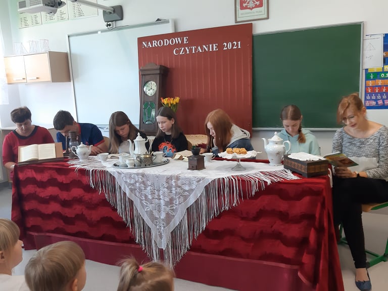 Wychodząc naprzeciw inicjatywie Pary Prezydenckiej, uczniowie naszej szkoły 6 września wysłuchali listu Prezydenta Andrzeja Dudy skierowanego do uczestników akcji. Ponadto pani E. Korga krótko wprowadziła słuchaczy w tematykę czytanego utworu. Wśród scenerii oddającej ducha tamtych czasów uczniowie i nauczyciele z zaangażowaniem czytali swoje role, próbując jak najwierniej przekazać uczucia i emocje bohaterów. Pozytywny odbiór wśród publiczności sprawił, że z niecierpliwością czekamy na następny rok i kolejną lekturę.