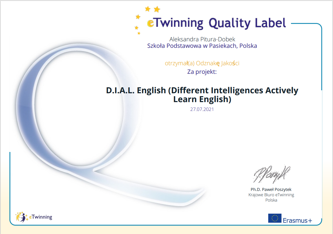 Otrzymała też Krajową Odznakę Jakości za międzynarodowy Projekt eTwinning “DIAL English”.