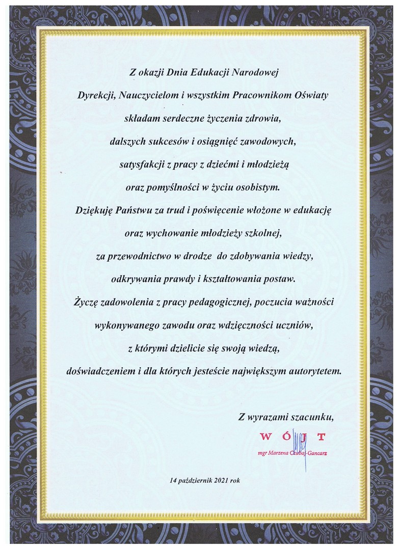 Dzień Edukacji Narodowej-życzenia Zdjęcia Załączniki DEN 2021 życzenia Lubelskiego Kuratora Oświaty [104.02 kB] Zobacz również Podsumowanie konkursu „Kardynał Stefan Wyszyński... Promocja naszych osiągnięć w mediach: Brązowa... Dzień Edukacji Narodowej Dzień Edukacji Narodowej-życzenia Apel Lubelskiego Państwowego Wojewódzkiego Inspektora... XXI DZIEŃ PAPIESKI 14 października 2021 Aktualności Wydrukuj Udostępnij Wyświetlono: 252