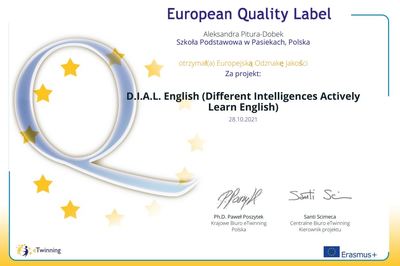 Miło nam poinformować, że w tym roku nasza szkoła otrzymała Europejską Odznaką Jakości za projekt: „D.I.A.L. English (Different Intelligences Actively Learn English)”.