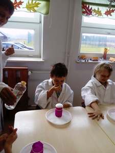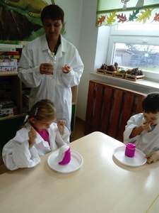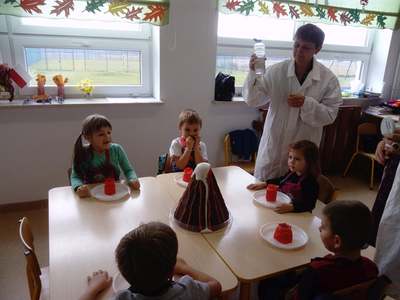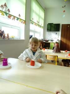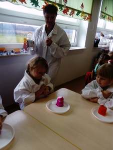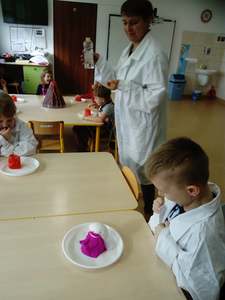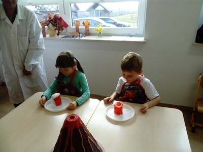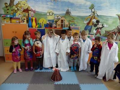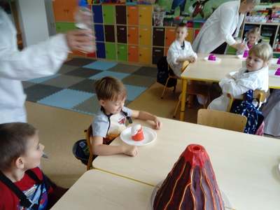 W tym tygodniu nasze przedszkolaki mogły na chwilę stać się prawdziwymi naukowcami, a sala przedszkolna zamieniła się w małe laboratorium. Dzieci dowiedziały się ,czym są doświadczenia chemiczne i każde z nich wykonało mini wulkan.