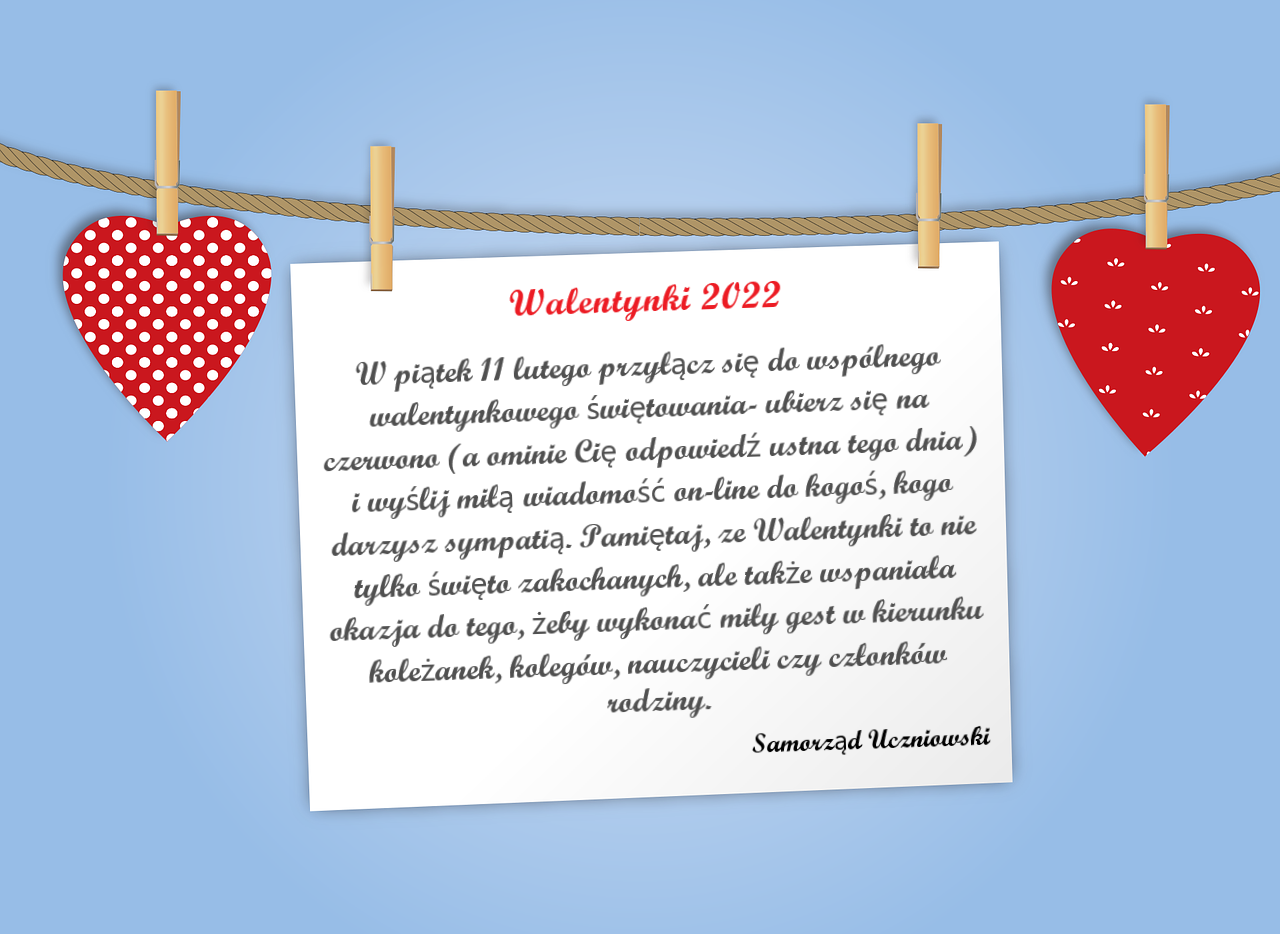 W piątek 11 lutego przyłącz się do wspólnego walentynkowego świętowania- ubierz się na czerwono (a ominie Cię odpowiedź ustna tego dnia) i wyślij miłą wiadomość on-line do kogoś, kogo darzysz sympatią. Pamiętaj, ze Walentynki to nie tylko święto zakochanych, ale także wspaniała okazja do tego, żeby wykonać miły gest w kierunku koleżanek, kolegów, nauczycieli czy członków rodziny.