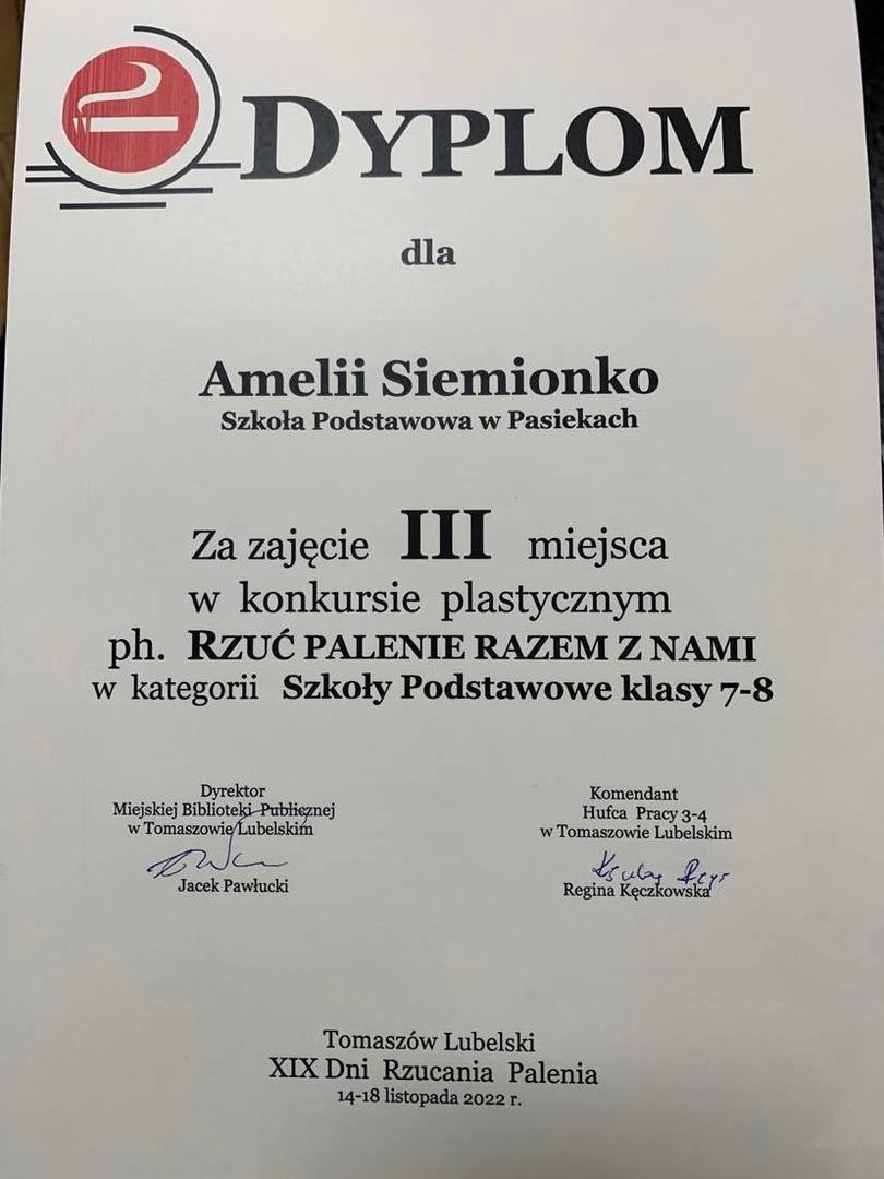 W dniu 21 listopada o godz. 9:00 w Miejskiej Bibliotece Publicznej im. Tomasza Zamoyskiego w Tomaszowie Lub. odbyło się ogłoszenie wyników Konkursu plastycznego w ramach Ogólnopolskich XIX Dni Rzucania Palenia pt. ,,Włącz myślenie – wyłącz palenie!”, którego organizatorami były: Lubelska Wojewódzka Komenda Ochotniczych Hufców Pracy, Hufiec Pracy w Tomaszowie Lubelskim oraz Miejska Biblioteka Publiczna im. Tomasza Zamoyskiego w Tomaszowie Lubelskim, a partnerami: Urząd Miasta w Tomaszowie Lubelskim.