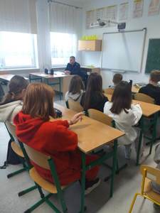 Dbając o bezpieczeństwo naszych uczniów w czasie zbliżających się ferii zimowych w dniu 11.01.2023 odbyło się w naszej szkole spotkanie z funkcjonariuszem Policji. Policjant przypomniał o rożnych zagrożeniach czyhających na uczniów w czasie ferii zimowych. Szczególną uwagę uczniów zwrócono na zasady bezpieczeństwa podczas uprawiania sportów zimowych i zabaw na świeżym powietrzu. Funkcjonariusz udzielił wskazówek jak bezpiecznie bawić się na śniegu i jak zachowywać się podczas kuligu.