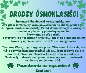 Samorząd Uczniowski wraz z opiekunami z głębi serca życzy Wam powodzenia