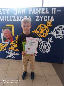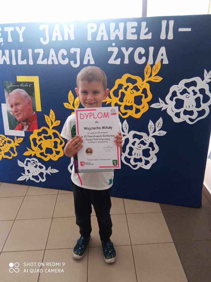 W dniu 04 października 2023 w Miejskiej Bibliotece Publicznej im. Tomasza Zamoyskiego w Tomaszowie Lubelskim odbyło się uroczyste wręczenie nagród i dyplomów w VI Powiatowym Konkursie poezji patriotycznej. Naszą szkołę reprezentowało dwoje dzieci z oddziału przedszkolnego- Wojciech Mikuła, który zdobył 3 miejsce i Paweł Mazurek, który otrzymał wyróżnienie. Wszystkim uczestnikom serdecznie gratulujemy i życzymy dalszych sukcesów.