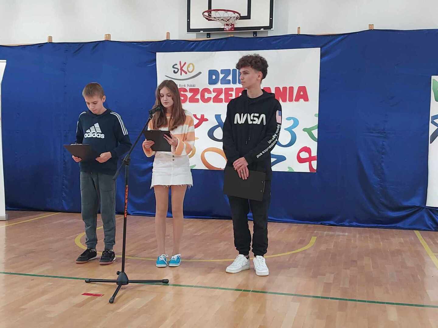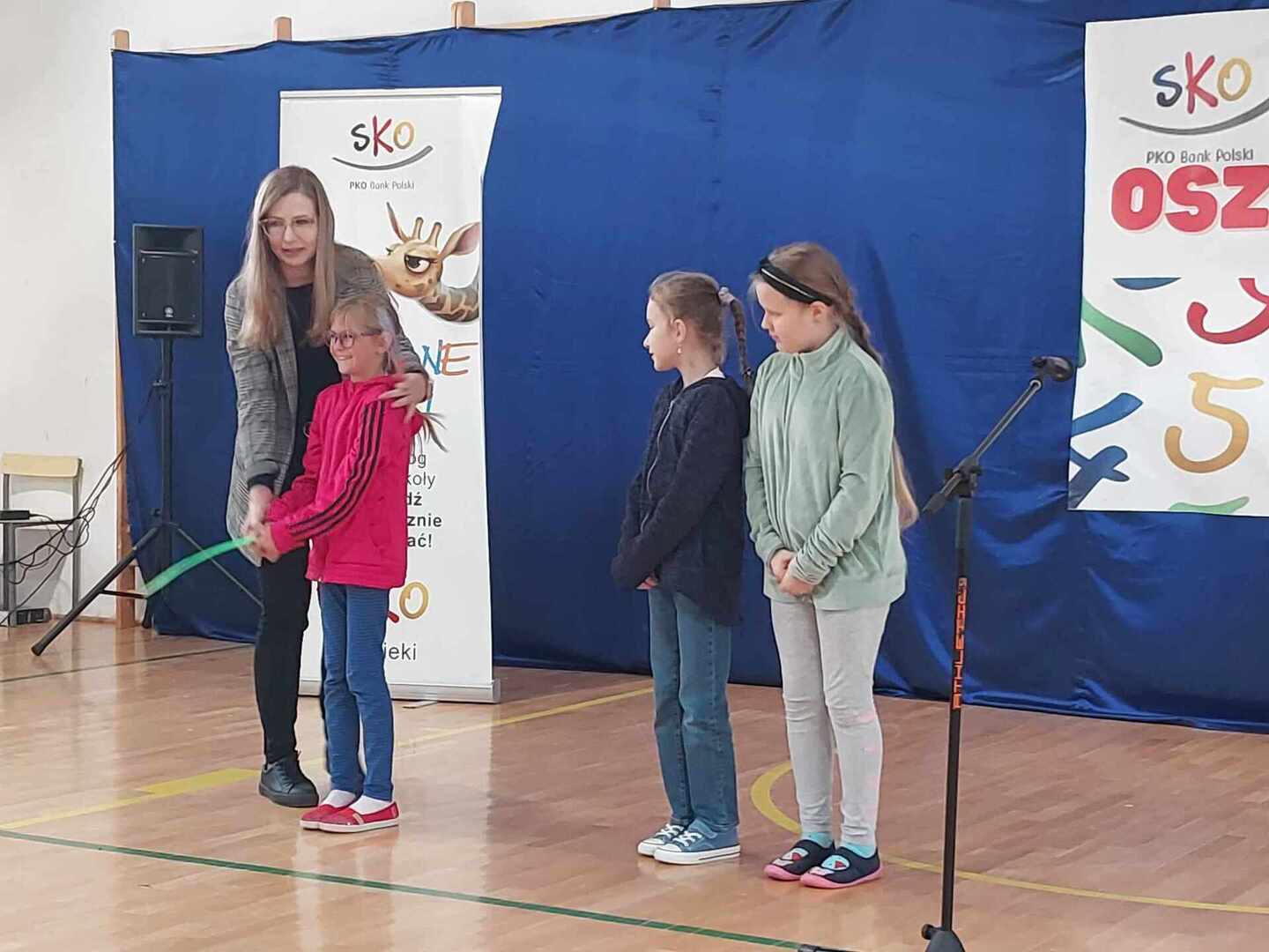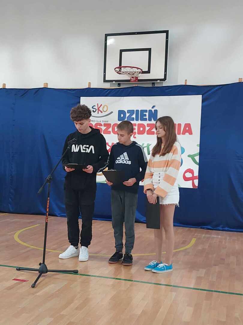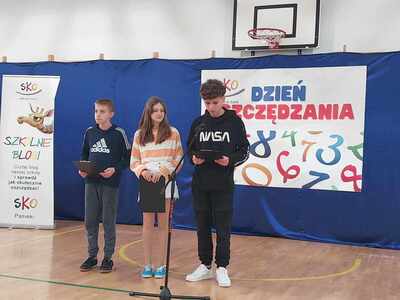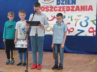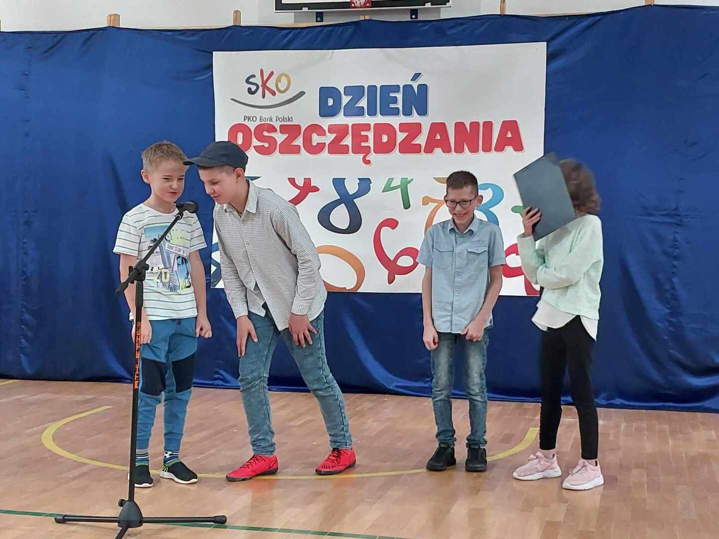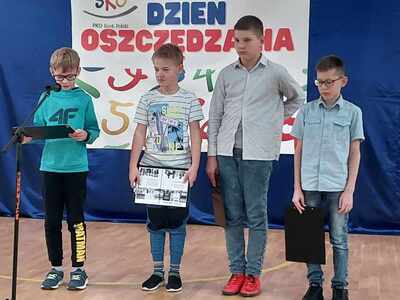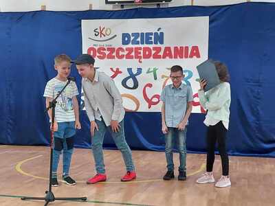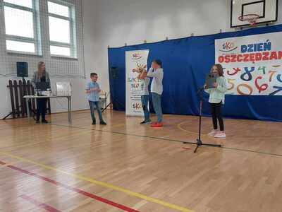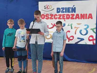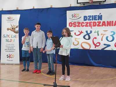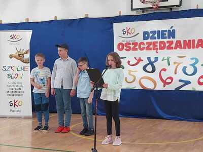 Następnie uczniowie klas IV i V zaprezentowali wiersze dotyczące pieniędzy i oszczędzania, a także przedstawili zabawny montaż słowno-muzyczny, który zachęcał do dołączenia do naszego szkolnego Koła SKO.