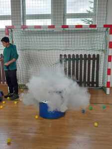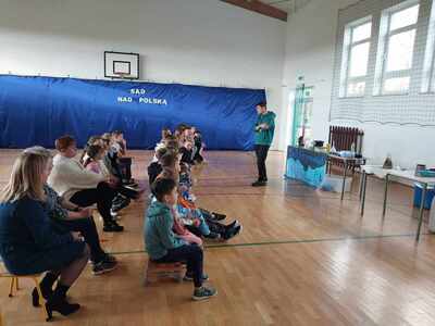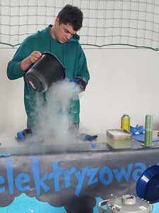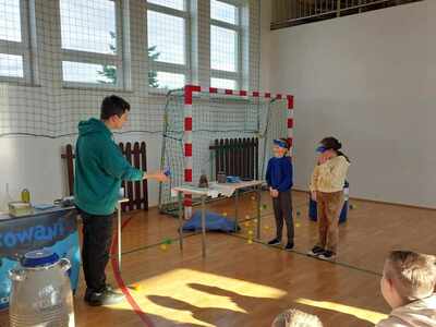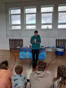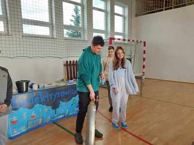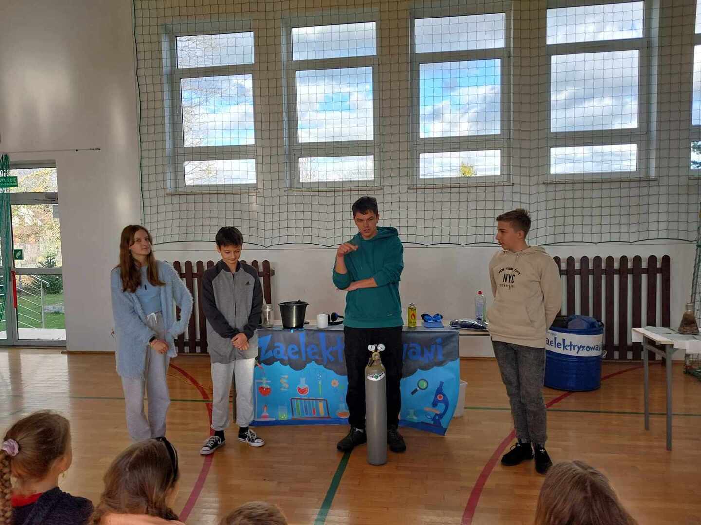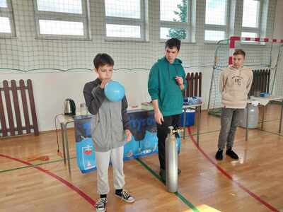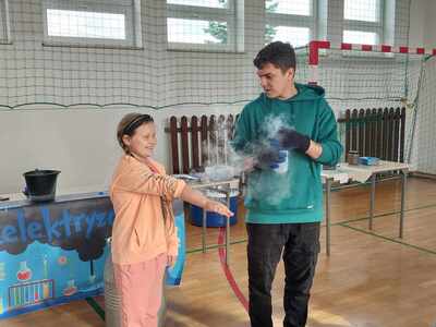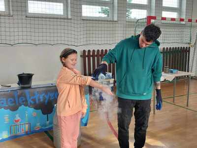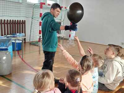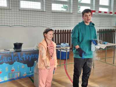 Dnia 6 listopada 2023 roku uczniów klas 0-VIII Publicznej Szkoły Podstawowej w Pasiekach odwiedziła Grupa animatorów z Lublina „Zaelektryzowani”, która przybliżyła wszystkim wiedzę z zakresu chemii i fizyki. Tematem zajęć były właściwości fizyczno-chemiczne wybranych gazów. Prezentujący pokazał wiele ciekawych doświadczeń z wodorem, helem, azotem, tlenem, parą wodną. W czasie tej niezwykłej lekcji, uczniowie na własnych strunach głosowych sprawdzili działanie helu, który zmienił ich wysokość głosu podczas próby mówienia. Starali się spowodować wir w butelce z wodą, zobaczyli wybuch wytworzonego domowym sposobem wodoru, świecenie gazów, gdy przepływa przez nie prąd elektryczny. Obserwowali doświadczenia z użyciem mieszanki propan - butan oraz lewitującą piłkę. Prowadzący podkreślił, jak ważne jest bezpieczne obchodzenie się z ogniem i korzystanie z gazu w gospodarstwie domowym. Bardzo interesującymi eksperymentami były: „paląca się dłoń” i rura Bernoulliego. Dzieci bardzo aktywnie brały udział w pokazie chemiczno – fizycznych doświadczeń. Mogły one bezpośrednio zaobserwować zjawisko wystrzałowego spalania wodoru z kolorowymi piłeczkami, wrzenia ciekłego azotu, zmianę wysokości dźwięku w helu. Atrakcją były również „czarodziejskie okulary” tzn. odwracające gogle pozwalające na oglądanie świata do góry nogami! Do tego wcale nie trzeba było stawać na głowie. Plastikowe gogle wyposażone są w dwa pryzmaty, które odwracają widziany przez nie obraz. W zależności od ustawienia pryzmatów widzimy otaczający świat "do góry nogami" lub odwrócony " w lewo lub w prawo". Zakładając takie okulary uczniowie wywołali lawinę śmiechu, gdy próbowali uścisnąć sobie dłonie. Przedstawiona prezentacja spodobała się wszystkim uczestnikom. Prowadzącemu udało się w umiejętny sposób połączyć elementy humorystyczne, edukacyjne zachęcając obserwujących do wspólnego, bezpiecznego eksperymentowania. Dzięki czemu uczniowie poszerzyli swoją wiedzę z zakresu chemii, fizyki. Świetnie się bawili, miło i pożytecznie spędzili czas.