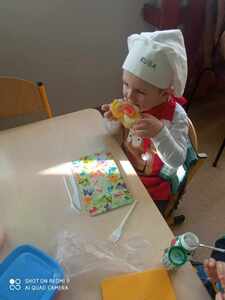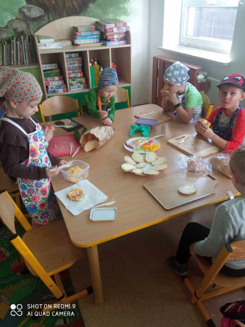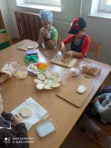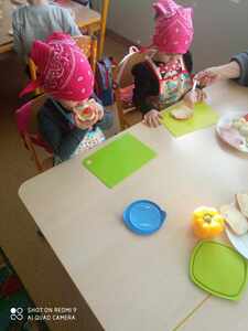 Dnia 16 listopada dzieci z przedszkola podjęły wielkie wyzwanie pod hasłem "Robimy zdrowe kanapki". Zanim jednak przystąpiły do zadania dowiedziały się, jakie wartości odżywcze mają warzywa. Na stoliku znajdowały się ułożone na talerzykach: pieczywo, masło, ser, jaja oraz warzywa. Po umyciu rąk oraz warzyw dzieci przystąpiły do przygotowania kanapek. Samodzielnie smarowały pieczywo masłem oraz układały dowolnie przez siebie wybrane witaminy. Wszystkie dzieci z wielkim apetytem zajadały przygotowane przez siebie kanapki.