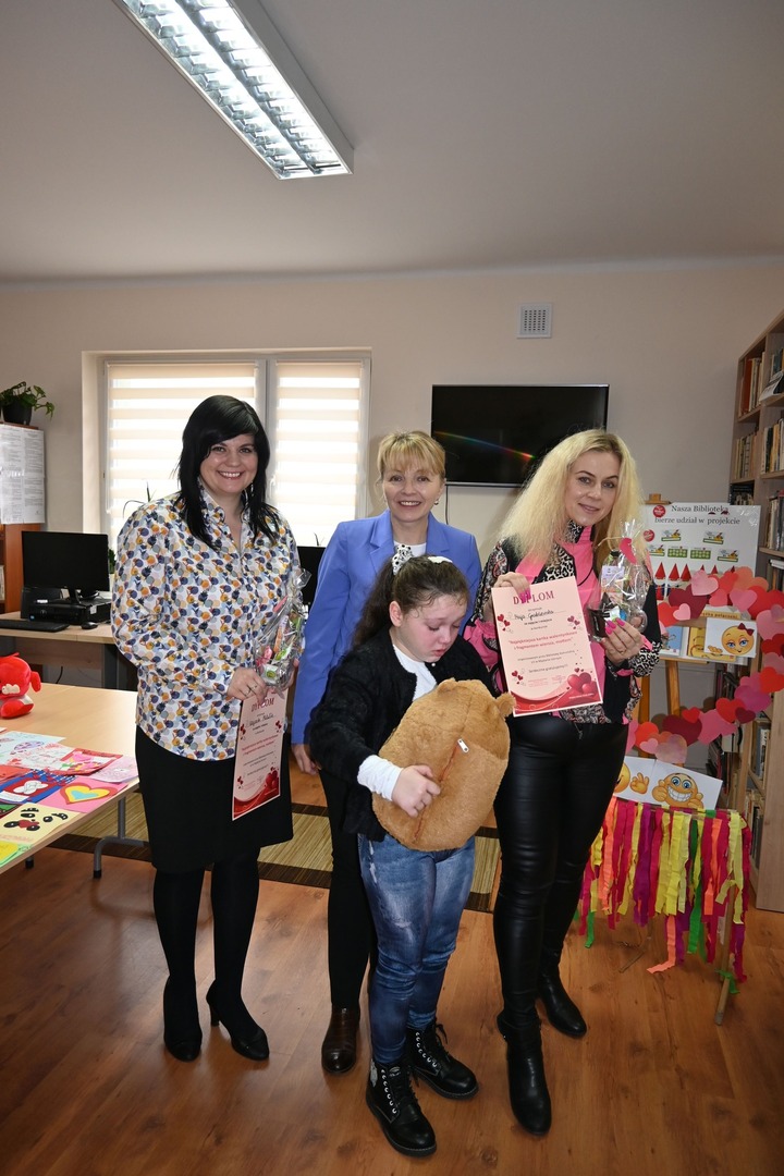W dniu 14 lutego 2024 r. w Bibliotece w Majdanie Górnym odbyło się uroczyste podsumowanie Gminnego Konkursu Plastycznego "Najpiękniejsza kartka walentynkowa z fragmentem wiersza, mottem", zorganizowanego przez Bibliotekę Komunalną z/s w Majdanie Górnym dla dzieci i młodzieży z terenu Gminy Tomaszów Lubelski. Wpłynęło aż 66 prac, wyróżniono 25 walentynek nagradzając je równorzędnymi nagrodami. Z naszej szkoły zostało nagrodzonych troje dzieci: Wojciech Mikuła z oddziału przedszkolnego, Maja Grablewska z klasy I, Sara Zionkowska z klasy II. Serdecznie Gratulujemy!!!