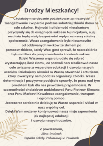 Organizatorzy zbiórki pragną serdecznie podziękować wszystkim mieszkańcom za zaangażowanie oraz wsparcie inicjatywy. Dzięki ich hojności udało się zrealizować cel zbiórki i przyczynić się do rozwoju szkolnej społeczności.