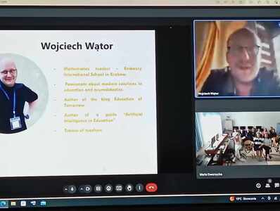 W ramach job shadowing gości z Turcji, mieliśmy niebywałą okazję wziąć udział w wystąpieniu pana Wojciecha Wątora, entuzjasty i pasjonata nowoczesnych rozwiązań w edukacji i neurodydaktyki. Zarówno nauczyciele, uczniowie, jak i goście zTurcji bliżej poznali aplikacje bazujące na SI (sztucznej inteligencji). Był również czas na rozmowy o bezpieczeństwie cyfrowym, sposobach wykorzystania technologii. Spotkanie stanowiło również doskonałą okazję do "szlifowania" języka angielskiego, gdyż właśnie w tym języku, ze względu na zagranicznych gości, poprowadzone zostało całe wystąpienie.