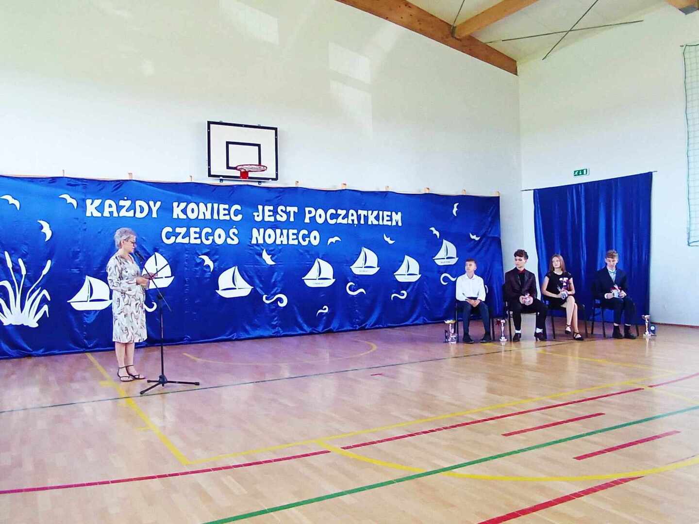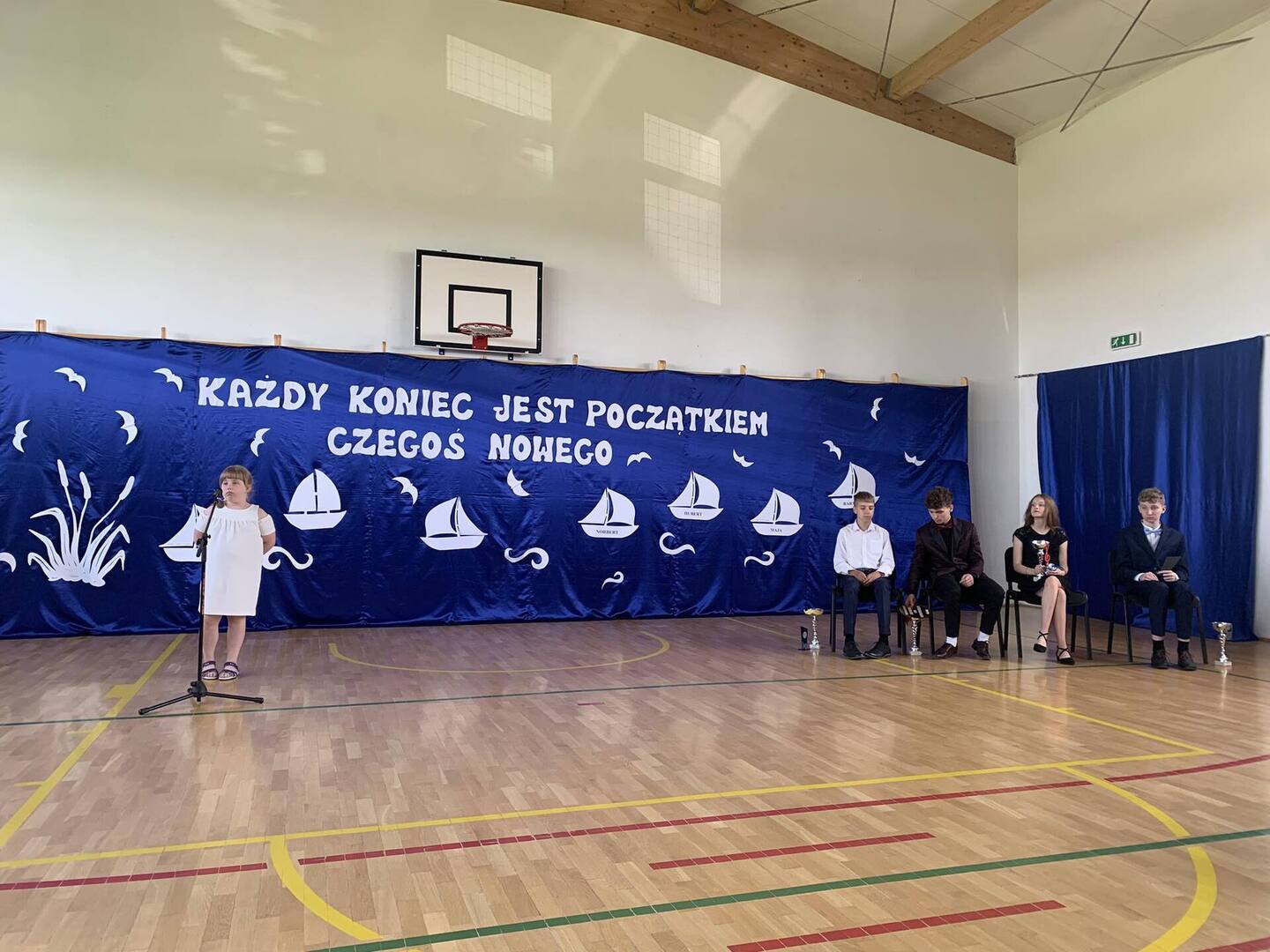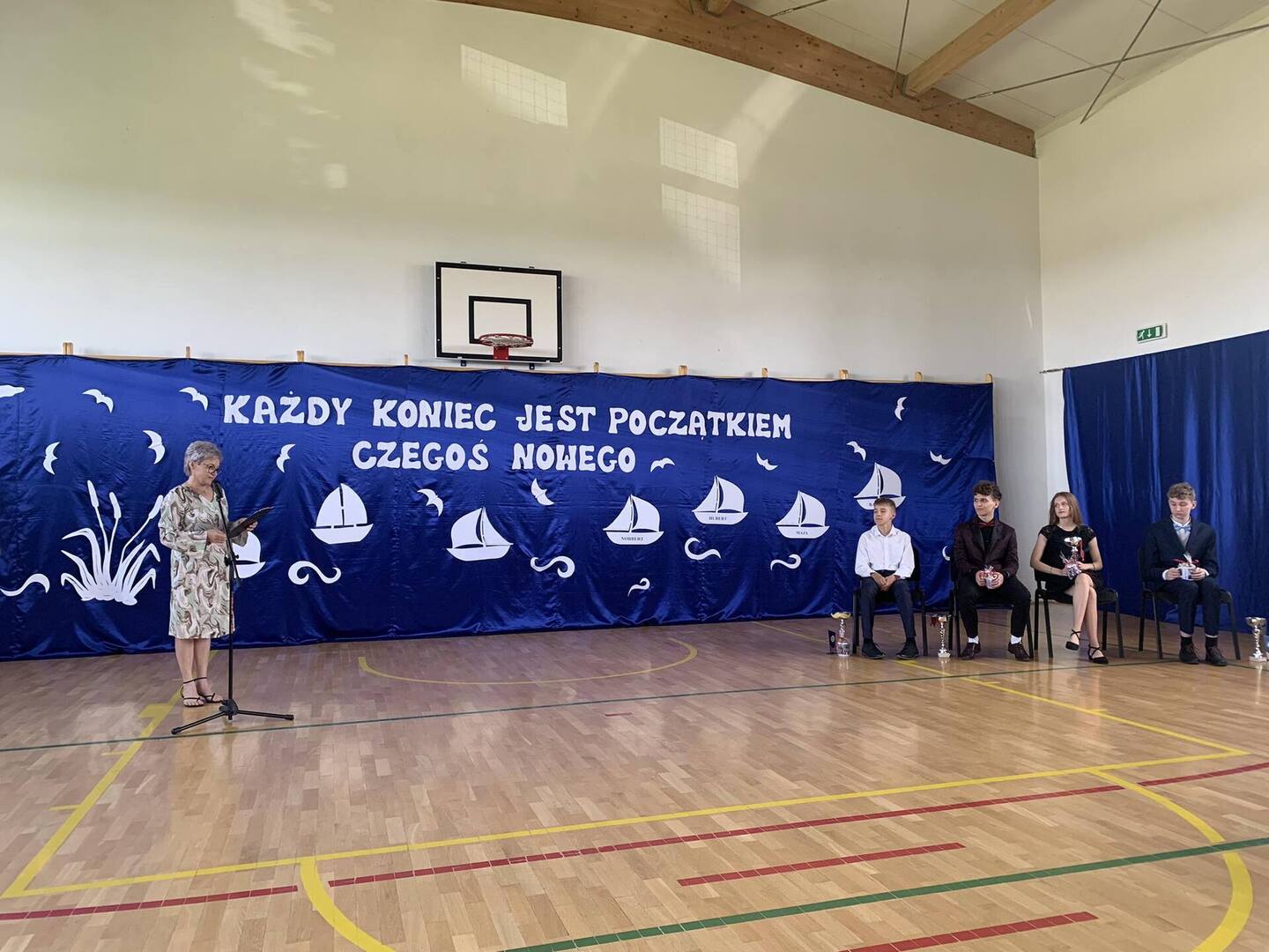 Na początek w Kościele Narodzenia Najświętszej Maryi Panny odbyła się Msza Święta, która była czasem refleksji i podziękowań za miniony rok. Serdecznie dziękujemy Księdzu Dziekanowi Grzegorzowi Chabrosowi za wygłoszone Słowo Boże i całoroczną współpracę. Po Mszy na sali gimnastycznej odbyła się część artystyczna przygotowana przez siódmoklasistów i ósmoklasistów. Pani dyrektor Alina Omelczuk wręczyła świadectwa i wyróżnienia oraz wygłosiła wzruszające przemówienia.