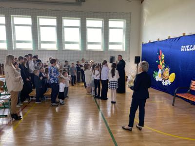 wszyscy razem, w sercu naszej szkolnej wspólnoty. Nie zabrakło także życzeń od pani dyrektor, która w ciepłych słowach życzyła wszystkim zdrowych, spokojnych i pełnych radości Świąt Wielkanocnych, aby nadchodzący czas napełnił serca nadzieją i miłością.