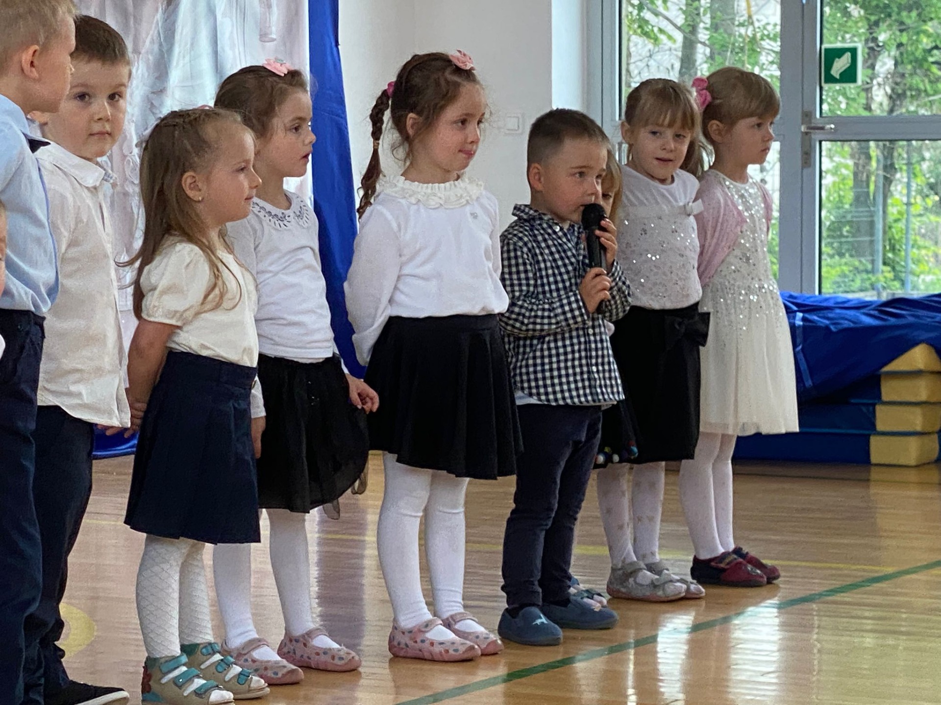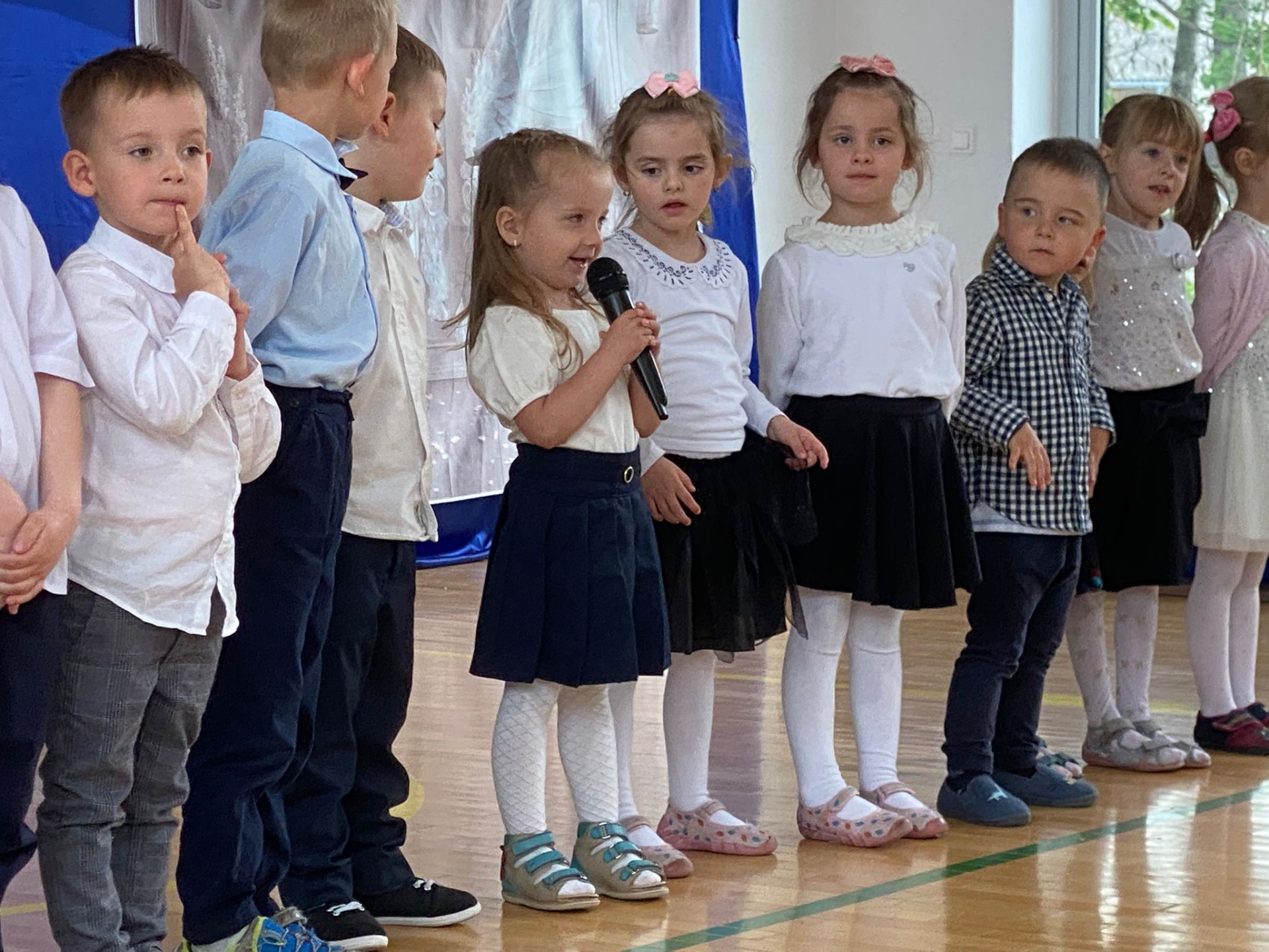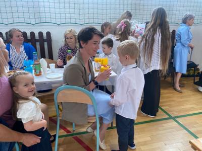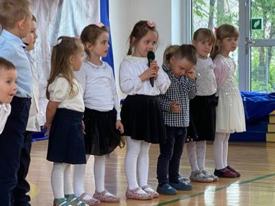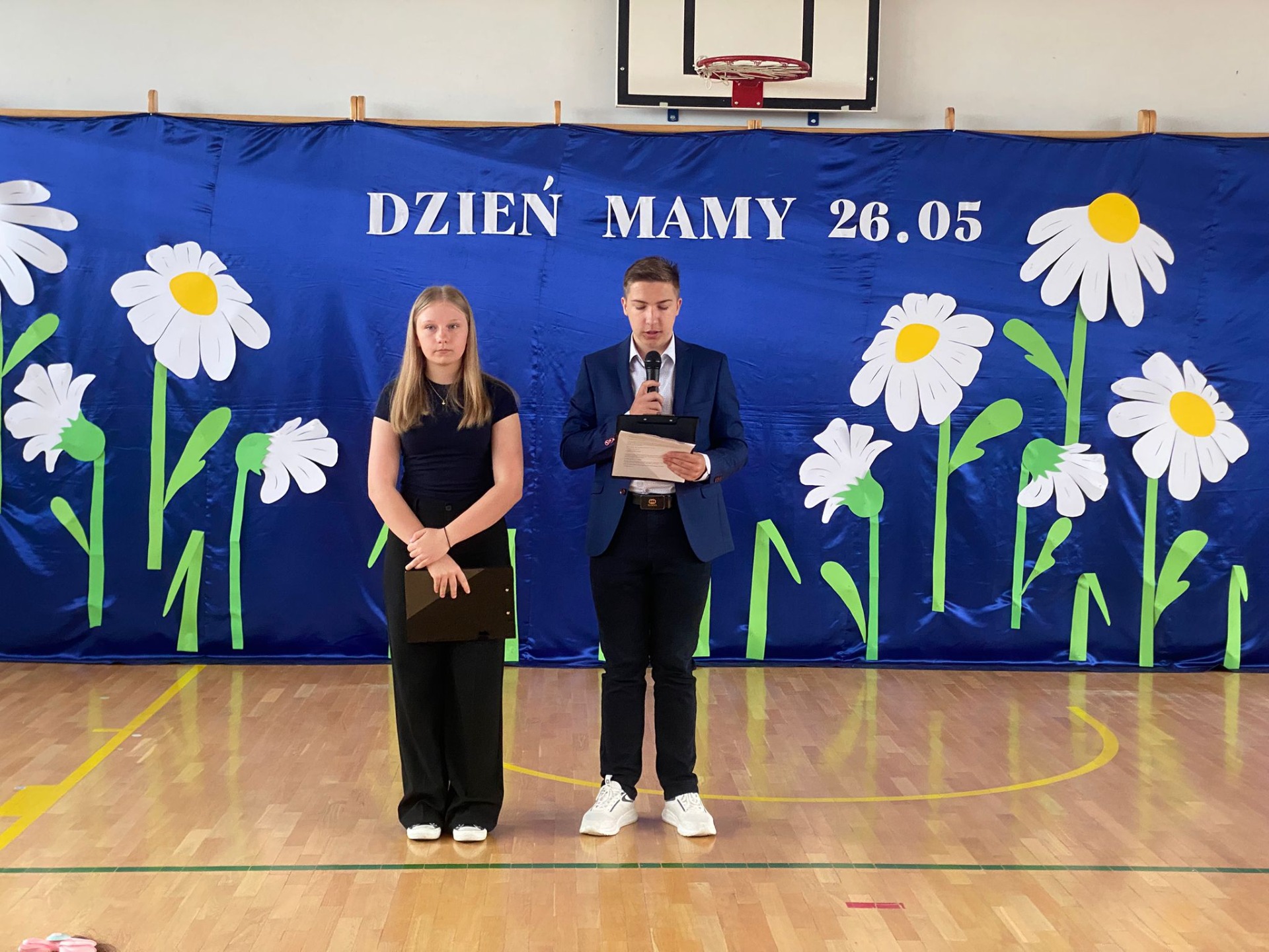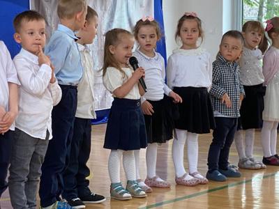 Uroczystość rozpoczęła się od serdecznego powitania zaproszonych gości przez panią Dyrektor. Następnie scenę przejęli nasi znakomici prezenterzy – Asia i Łukasz – którzy z humorem i klasą poprowadzili część artystyczną.