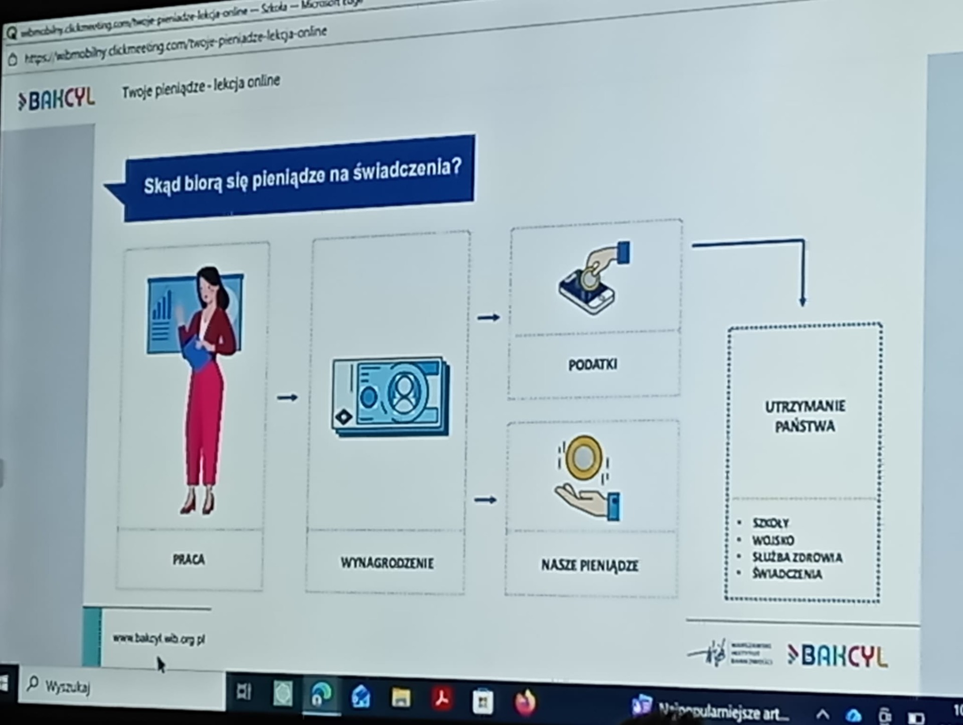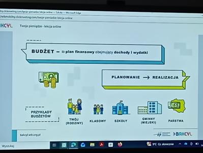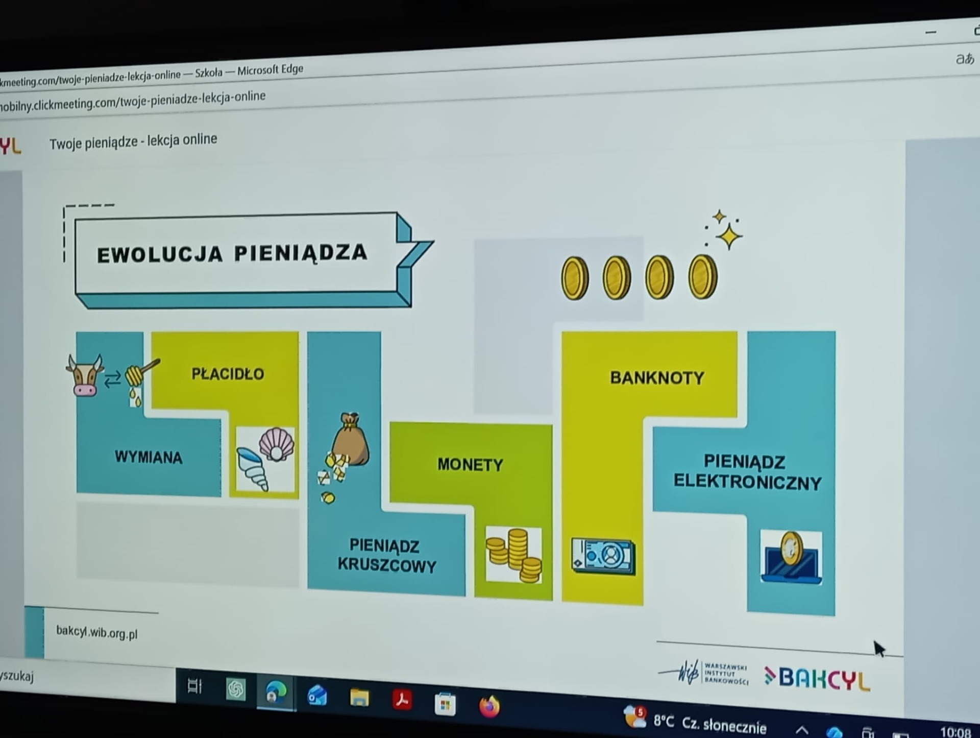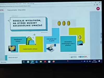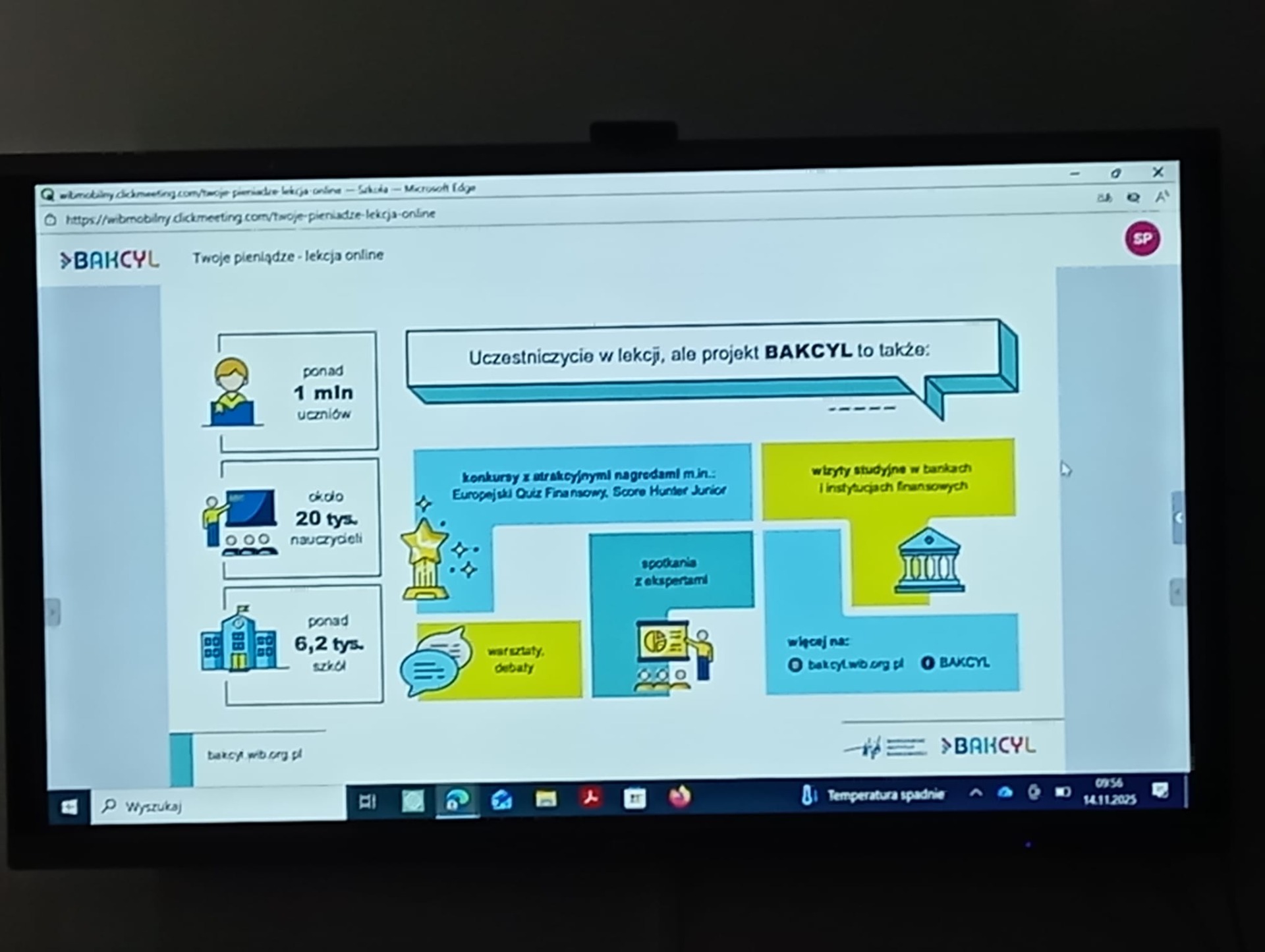 14 listopada 2025 uczniowie klas IV–VI wzięli udział w lekcji online „Twoje pieniądze” realizowanej w ramach programu BAKCYL – Bankowcy dla Edukacji Finansowej Dzieci i Młodzieży.