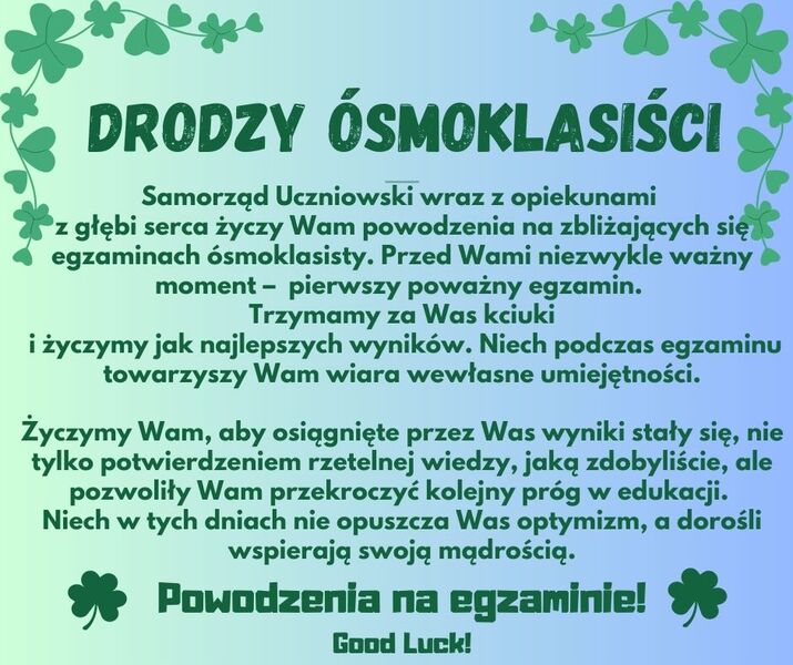 22 maja 2023 Aktualności Egzamin ósmoklasisty Drodzy Uczniowie klas VIII Samorząd Uczniowski wraz z opiekunami z głębi serca życzy Wam powodzeniana zbliżających się egzaminach ósmoklasisty. Przed Wami niezwykle ważnymoment... Czytaj więcej