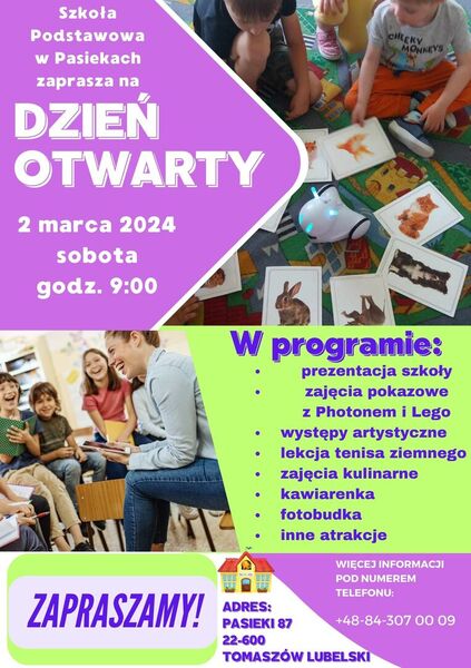 22 lutego 2024 Ogłoszenia Dzień Otwarty Dyrektor Szkoły Podstawowej w Pasiekach zaprasza dzieci wraz z rodzicami na Dzień Otwarty Szkoły, który odbędzie się 2 marca 2024 o godzinie 9:00. Czytaj więcej