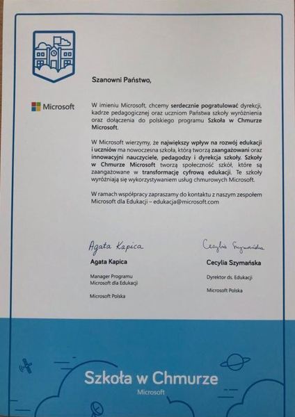 Z dumą informujemy, że Dyrektor ds. Edukacji Microsoft Polska, pani Cecylia Szymańska oraz Manager Programu Microsoft dla Edukacji Microsoft Polska, pani Agata Kapica, przekazały certyfikat i list gratulacyjny...