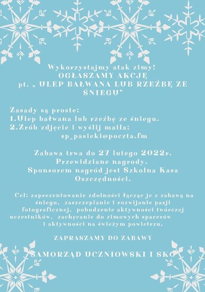 03 lutego 2022 Aktualności Akcja „ ULEP BAŁWANA LUB RZEŹBĘ ZE ŚNIEGU” Wykorzystując atak zimy, Samorząd Uczniowski i SKO postanowili zachęcić uczniów i przedszkolaków ze Szkoły Podstawowej w Pasiekach do wyjścia na świeże powietrze i aktywnego spędzenia... Czytaj więcej
